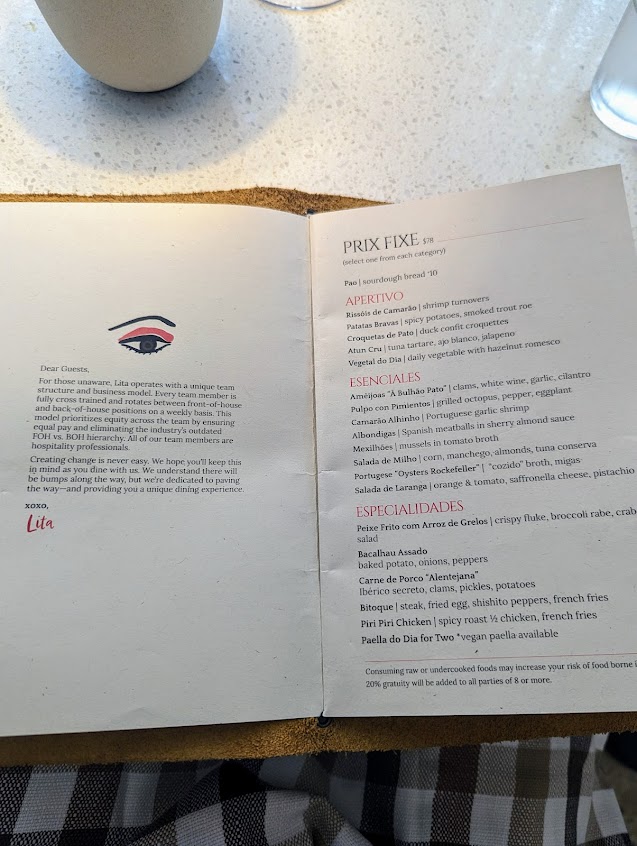 Really loved the concept and execution of Lita, serving an interesting prie fix menu (although they are changing to à la carte soon) with great options! The Tuna Crudo was a delicious first bite, and I’d absolutely say the Portuguese Shrimp is one of the best options for the second. The black cod was so soft and delicious, but the seafood rice with it was really salty. I would say all the other mains, especially the Steak, were better in my opinion. The drinks were interesting, and if you like a strong briny flavor, the Spanish martini is great. Most of their drinks are pretty strong as a warning. Service was top notch, everyone was super attentive, and I like that they cycle the chefs through front and back of house, so everyone is very knowledgeable. Overall, loved the atmosphere, very intimate and fun energy with seeing the entire kitchen working right there, and would definitely visit again!